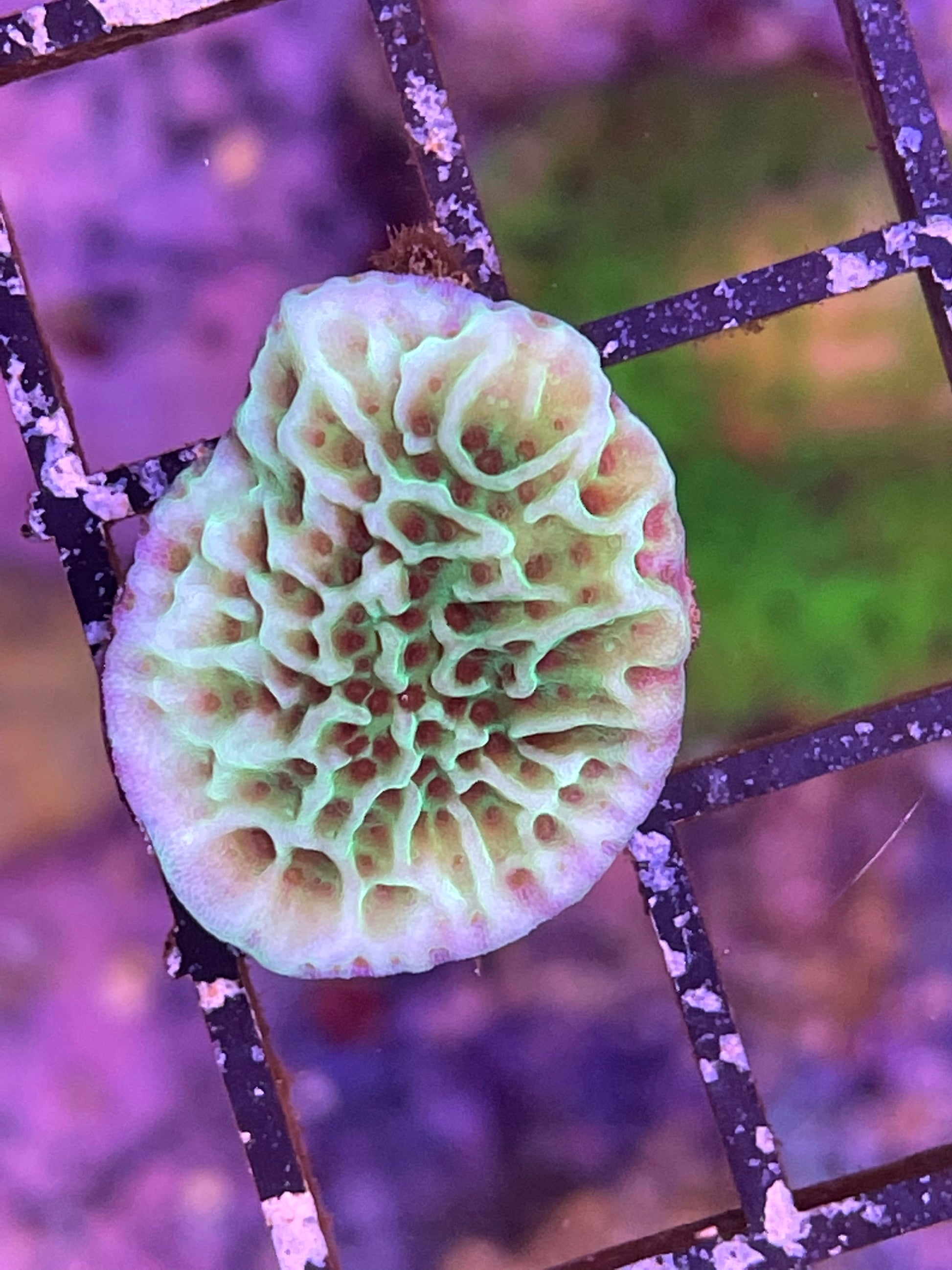 Unorthodox Reef vrs of the Mind trick Montipora. Under certain lighting it can develop reddish/brown polyps and purple rim.